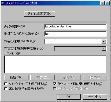 ファイルタイプのタグを選んで、拡張子jarが登録されていなければ、登録してください。(下の図)