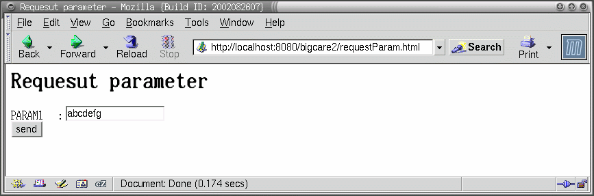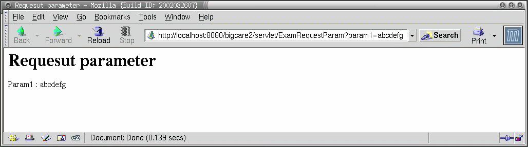 ブラウザのアドレスフィールドに、http://localhost:8080/bigcare2/servlet/ExamRequestParam?param1=abcdefgと入力すると、以下の応答画面が表示されます。