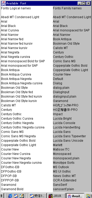 実行結果は、左の列が論理フォント名で表示、右の列がフォントファミリー名で表示、MS-Windows98で実行したものです。
