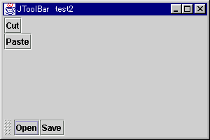setFloatable() method BorderLayout.SOUTHに配置されたToolBarはDrug&Drop出来ますが、 BorderLayout.NORTHに配置されたToolBarはできません。 setFloatable()メソッドにfalseを指定する事で、Drug&Dropは無効となります。 |