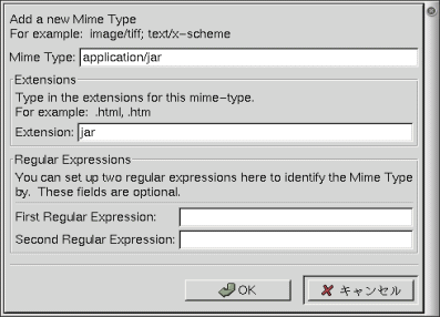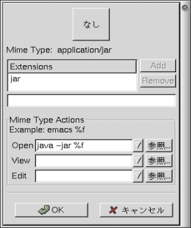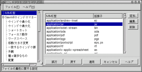 | 1・GNOMEコントロールセンターを起動し、 MIME型のwindowを開く。 この例では、MIME型として、 javaの書庫fileであるjar fileを登録し、 ファイル名(jar file)のdouble clickで java applicationが起動するように設定しています。 追加ボタンを押す。 |